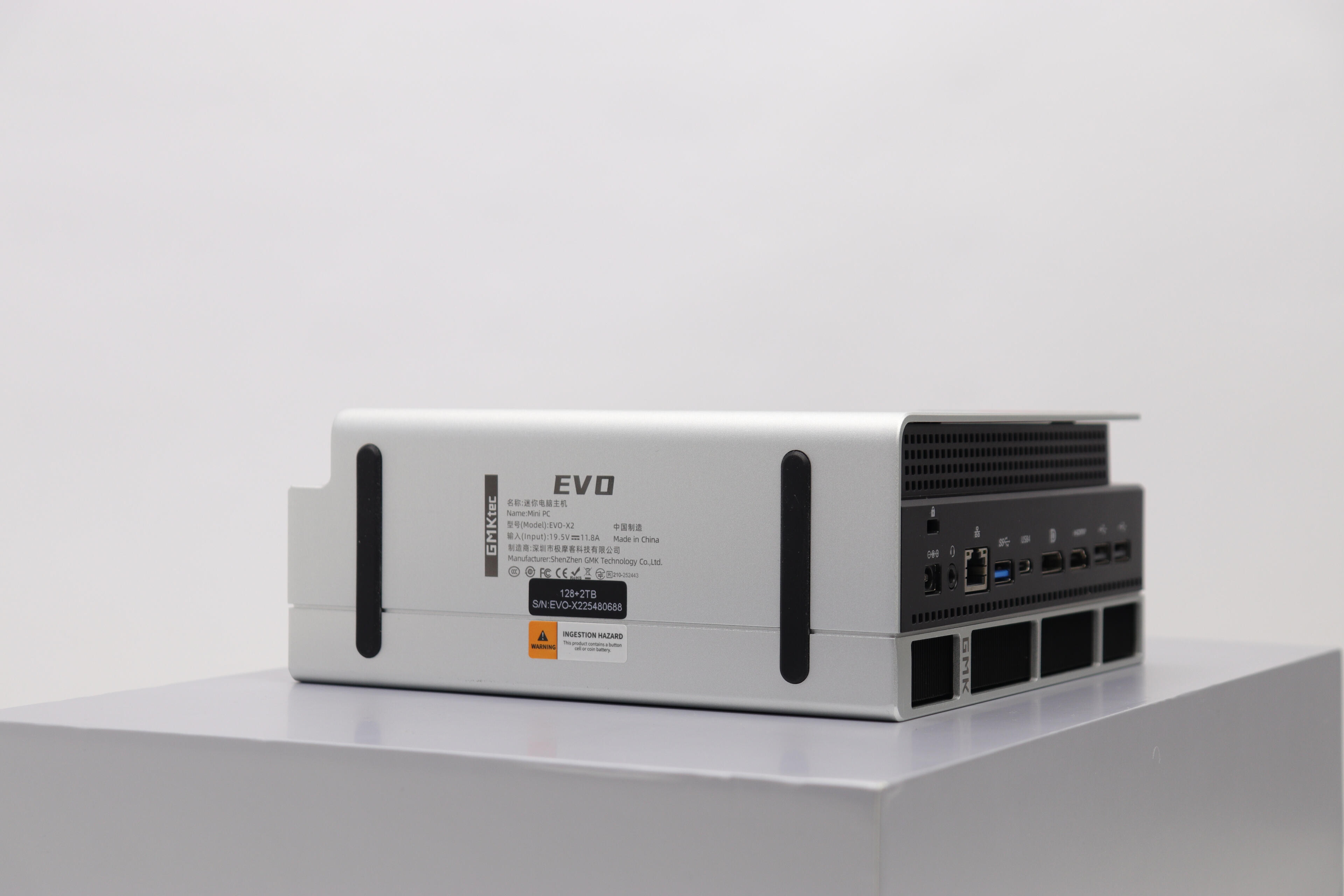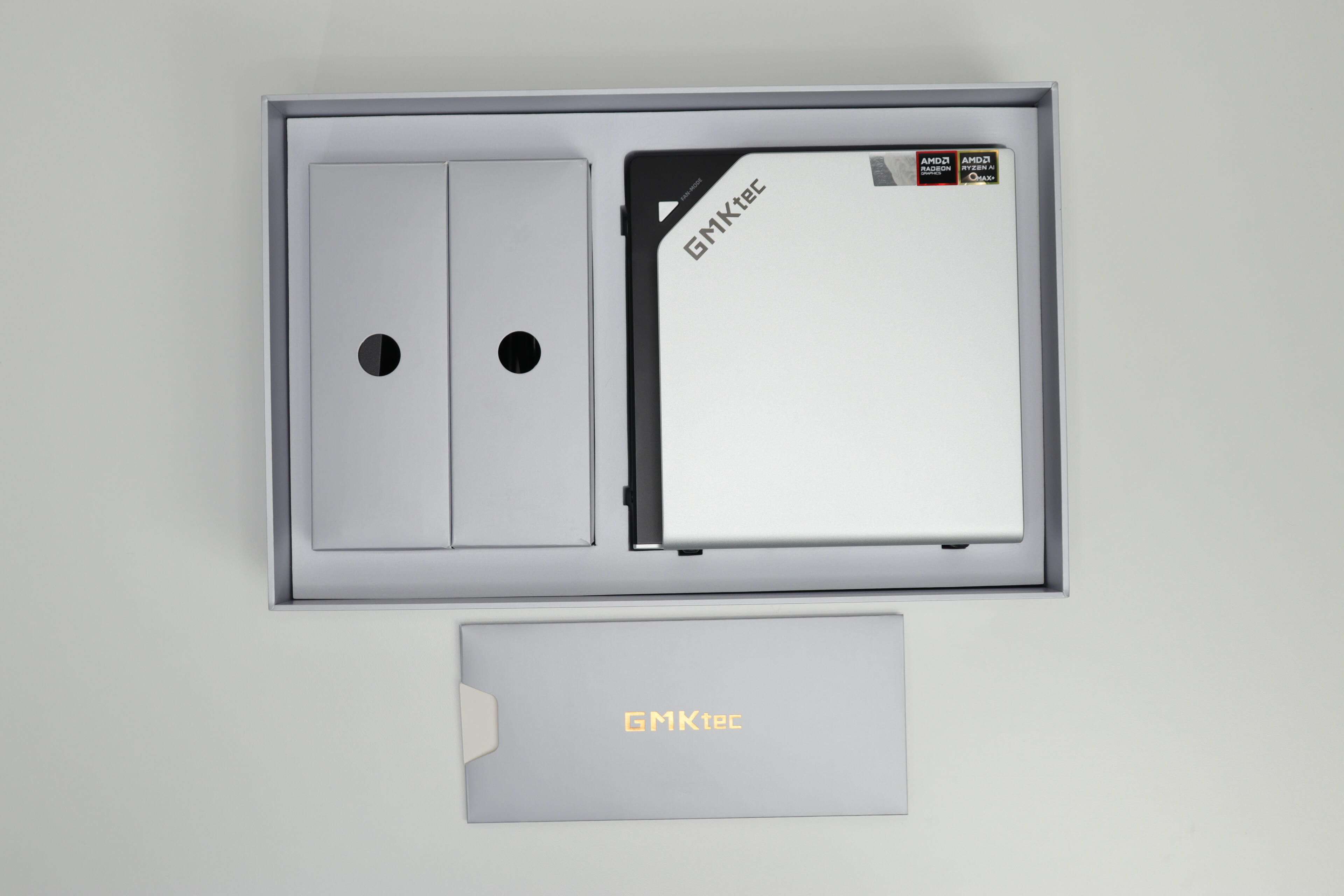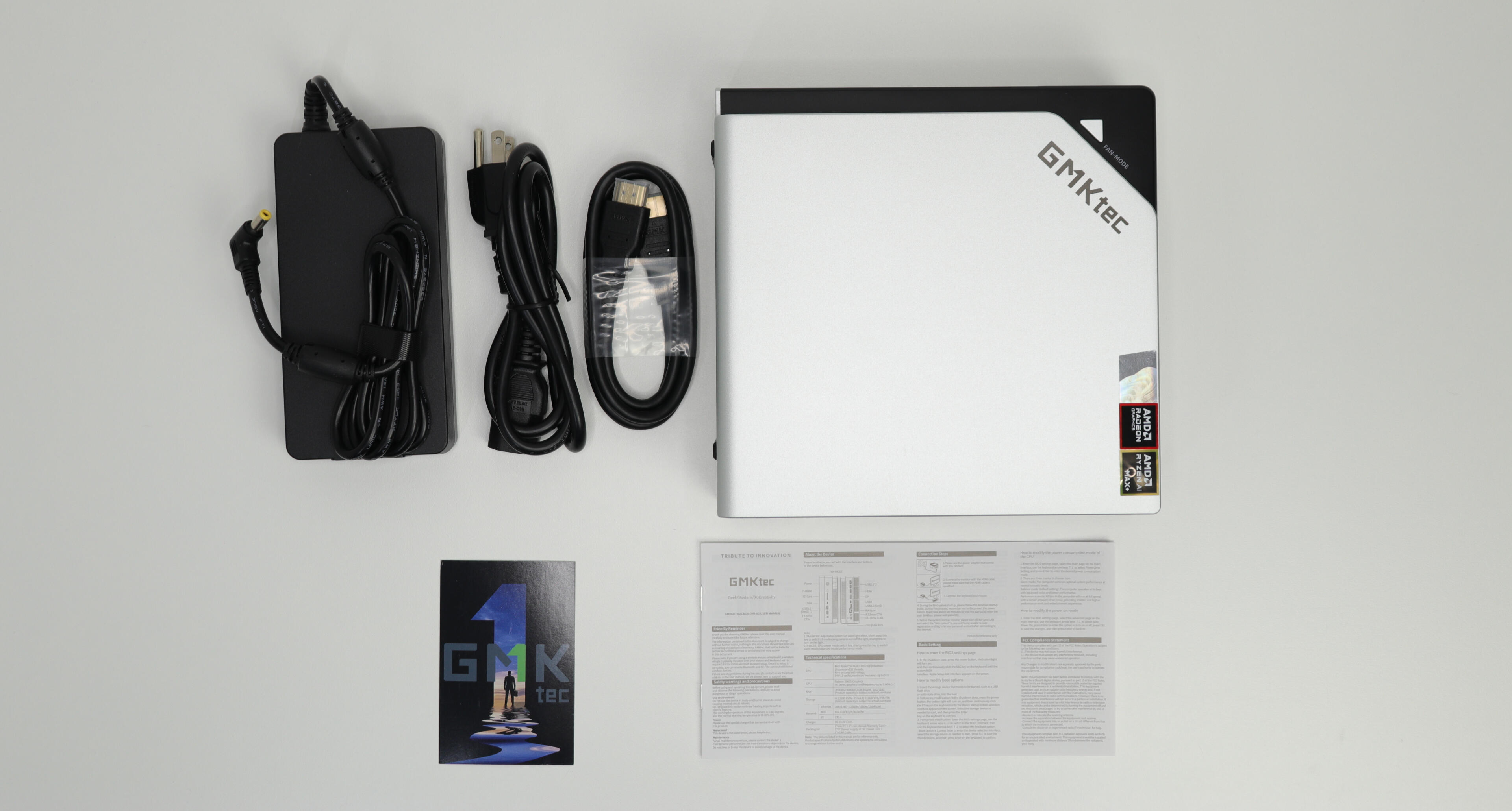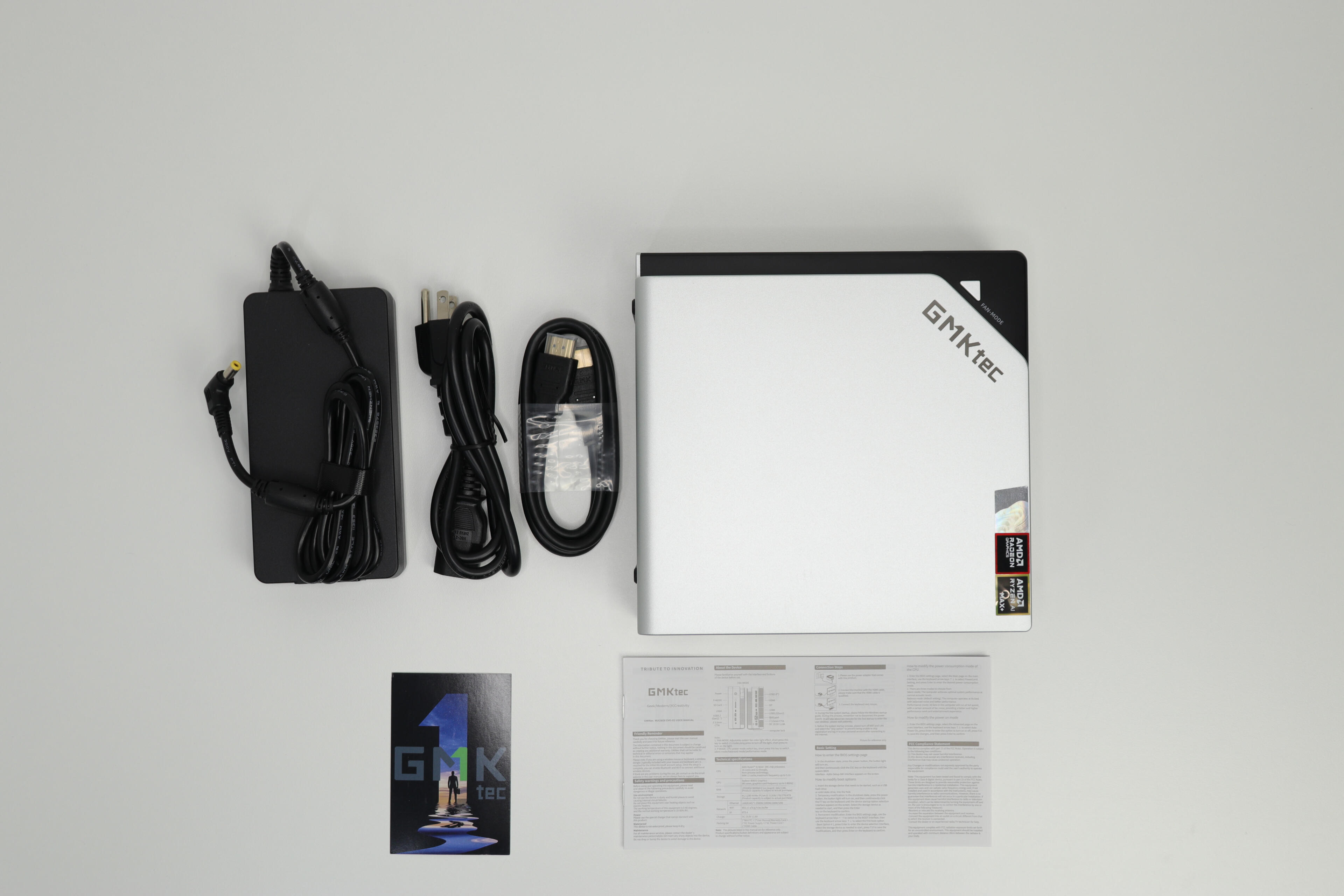 The packaging was very good.The PC was firmly held in place inside a block of rigid foam, and even the top of the box contains an additional foam layer.The different cables were separated into two small boxes that are also held firmly in place by the foam.Included in the box:* GMKtec Evo-X2